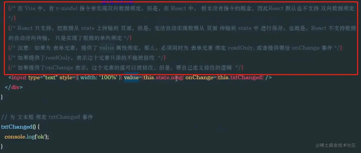 v-model指令,将表单控件和我们的data上面的属性进行双向数据绑定,数据变化和页面之间的变化是同步的! - 在React.js中,默认没有提供双向数据绑定这一功能,默认的,只能把