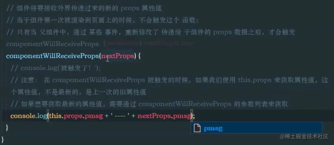 componentWillReceiveProps: 组件将要接收新属性,此时,只要这个方法被触发,就证明父组件为当前子组件传递了新的属性值;