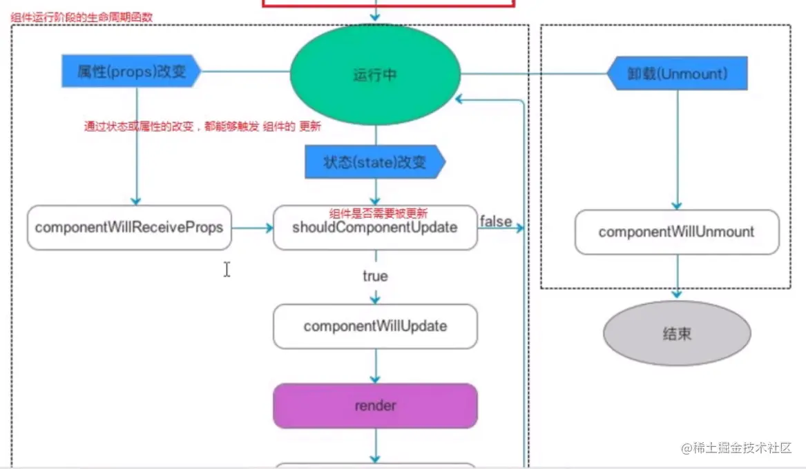 - 组件运行阶段:也有一个显著的特点,根据组件的state和props的改变,有选择性的触发0次或多次;