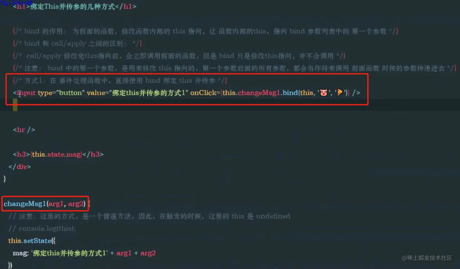 <input type="button" value="在事件中绑定this并传参" onClick={this.handleMsg1.bind(this, '🍕', '🍟')} />