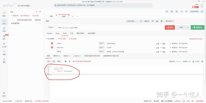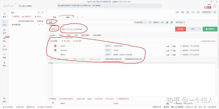 在试着发送一个post请求。接口名称登录,请求方法post,url本地测试地址,传递的参数