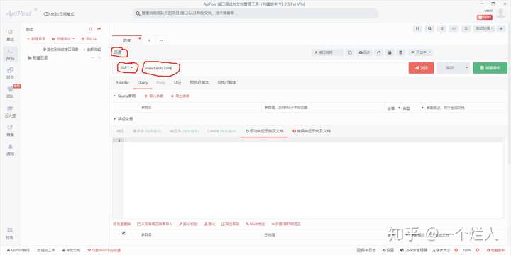 我们在APIs里面新建接口,然后选择请求方法,url,需要传递的参数。然后点击发送,就实现了一个简单的接口测试,现在我们一百度为例子。