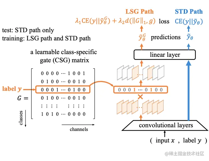 为了让网络在训练中分化类特定卷积核,论文在标准的前行推理(standard path, STD)中引入可学习的类特定控制门(Class-Specific Gate path, CSG) ,用来有选择性地阻隔不相关特征维度。