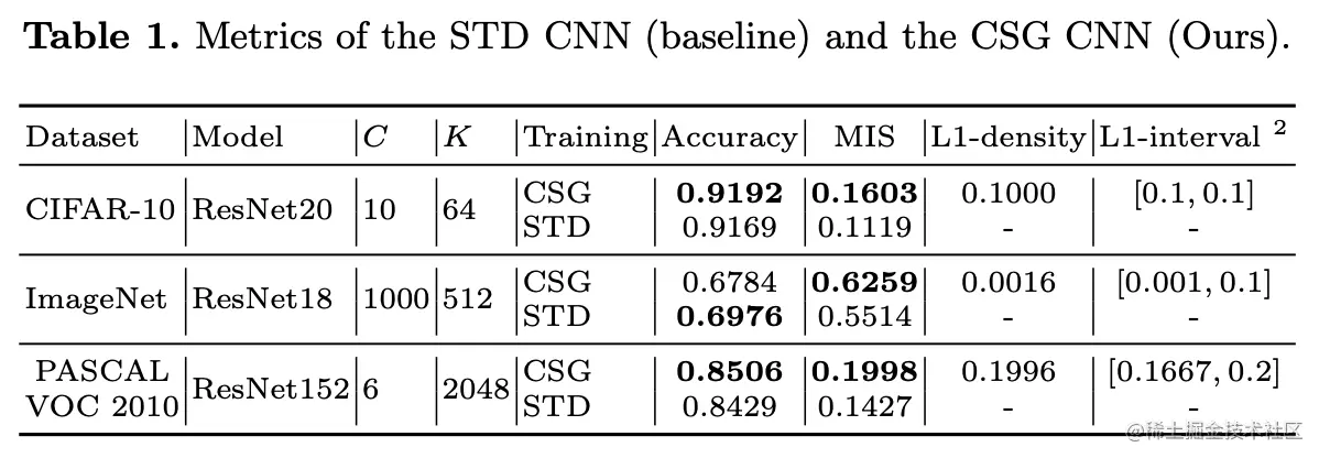 结果如表1所示,可以看到CSG网络在分类表现上仅比STD网络要稍微好一点,但其它指标要高出很多。