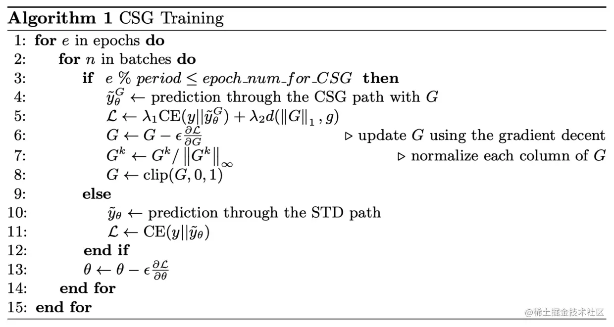 由于CSG路径阻隔了大部分的特征,所以CSG路径的梯度回传比STD路径弱很多,如果按正常的方式进行训练,收敛效果会很一般。为此,论文提出alternate training scheme,在不同的周期交替地使用STD/CSG路径的梯度。如算法1所示,在CSG路径的周期,使用梯度更新和进行更新,而在STD路径的周期,则使用梯度进行更新。根据实验验证,这种训练方法在训练初期的分类效果会周期性波动,但最终的训练效果比正常的训练方法要好,同时卷积核也能逐渐分化成类特定卷积核。