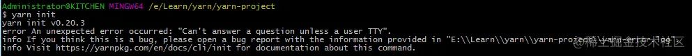 Yarn init 报错 Victoria 2020-10-09 462 阅读1分钟 yarn init的时候 并没有像 npm init 直接顺利初始化,而是报以下错误 我是直接 在 git bash 去 操作的,报的错,没有找到真正原因 通过cmd 命令 进入指定目录下,执行 yarn init ,可以成功进行初始化