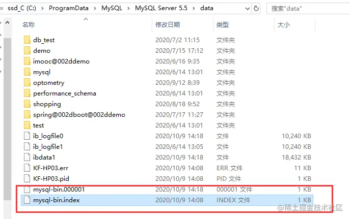 用记事本打开my.ini,在mysqld下面添加SELECT @@datadir配置好my.ini后保存,重启mysql,会在你mysql下出现和两个文件,其中用来记录了所有DDL与DML(select除外)语句,是二进制文件server_id=1918 #binlog日志文件,以mysql_bin开头,六个数字结尾的文件:mysql-bin.000001(可指定路径,这里用默认) log_bin = mysql-bin #binlog日志格式,默认为STATEMENT:每一条SQL语句都会被记录;ROW:仅记录哪条数据被修改并且修改成什么样子。 binlog_format = ROW #expire_logs_days= 7 #binlog过期清理时间; #max_binlog_size = 100m #binlog每个日志文件大小; - 当你开启或已配置好mysqlbinlog后