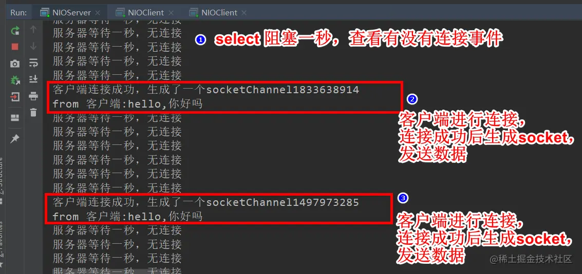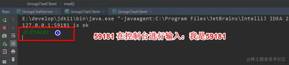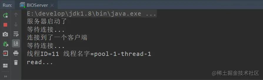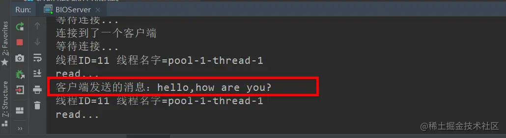 //这里需要注意的是:在read方法中会阻塞