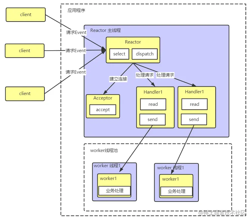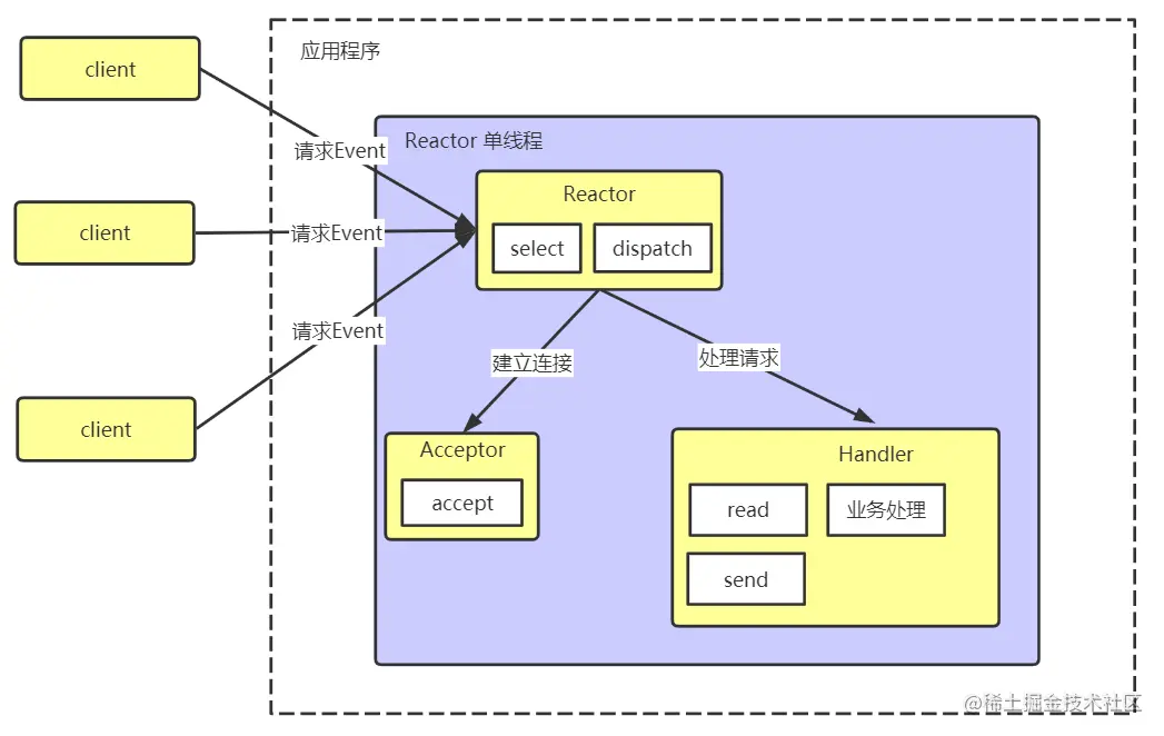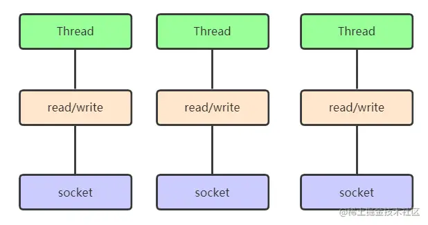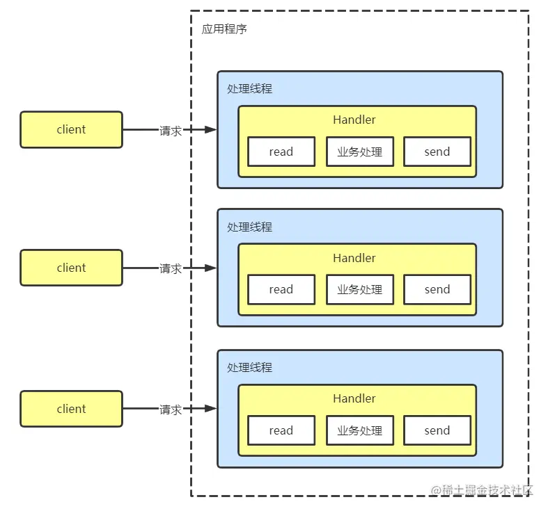 每个请求都需要创建独立的线程,与对应的客户端进行数据 Read,业务处理,数据 Write