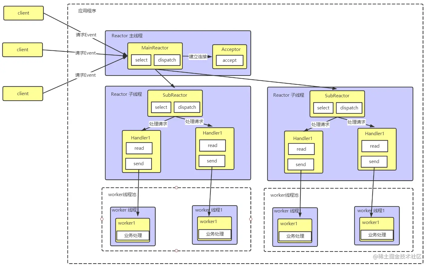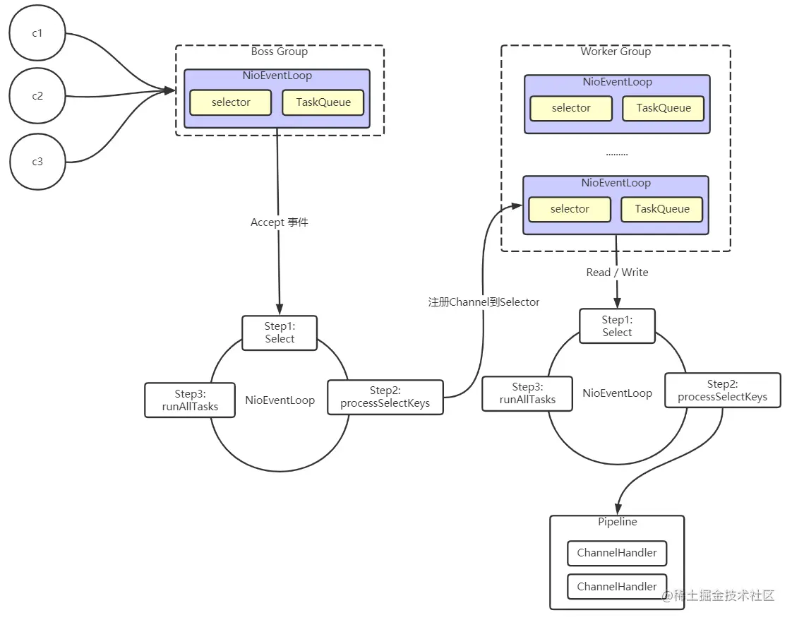 // 2. bossGroup 只是处理连接请求 , 真正的和客户端业务处理,会交给 workerGroup 完成