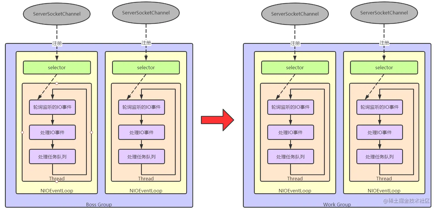 bootstrap.group(bossGroup,workGroup) //Netty服务端有两个工作组,这里得设置上