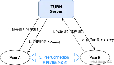 STUN 服务器其实就是帮助在NAT之中的设备获取自己的公共IP。比如图中Peer A 想知道自己的公共IP,就直接发送请求给相应的STUN服务器即可获取,然后A就可以告诉B自己的IP从而与B建立连接。但是如果Peer A所在的NAT更复杂,STUN服务器也无法提供Peer A相应的IP地址信息。这时就要用到TURN,TURN中的R(Relay)是中继站的意思,顾名思义,TURN其实就是一个中继服务器,它将在A和B之间帮忙转发所有的数据(也就是说A和B是没有直接连接的)。