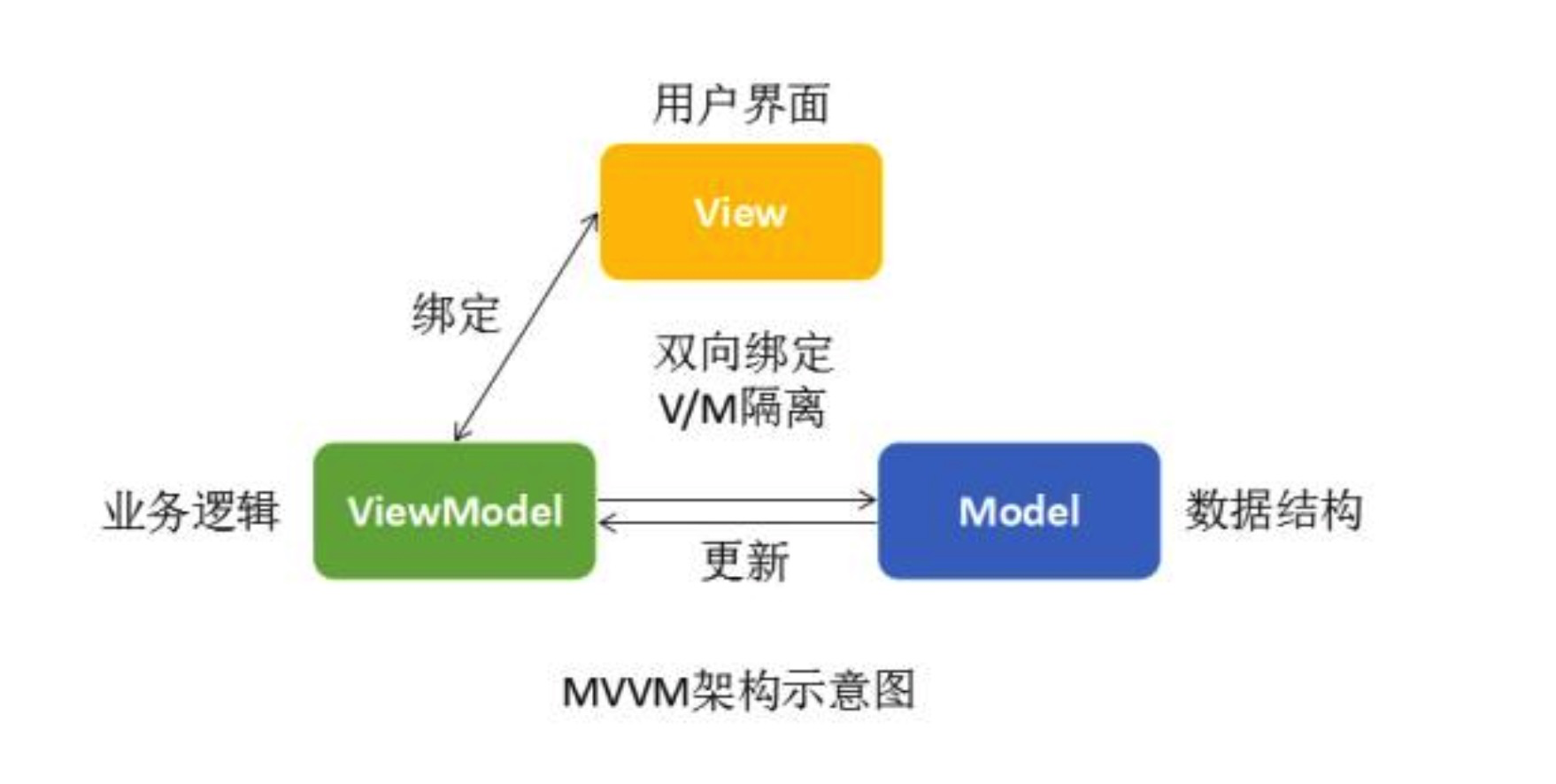 MVP的升级款,考虑到在MVP下,Presenter通过接口来获取View层的数据来作为参数,然后通过Model来进行数据处理,处理结果通知到Presenter,然后在设置View。这样,View将手动定义很多接口方法,很不方便。MVVM通过双向绑定,将View上的数据映射到了一个Bean中,对Bean的操作等于操作的View。Presenter与View的交互再也不用通过接口了,直接持有Bean的引用来进行操作。