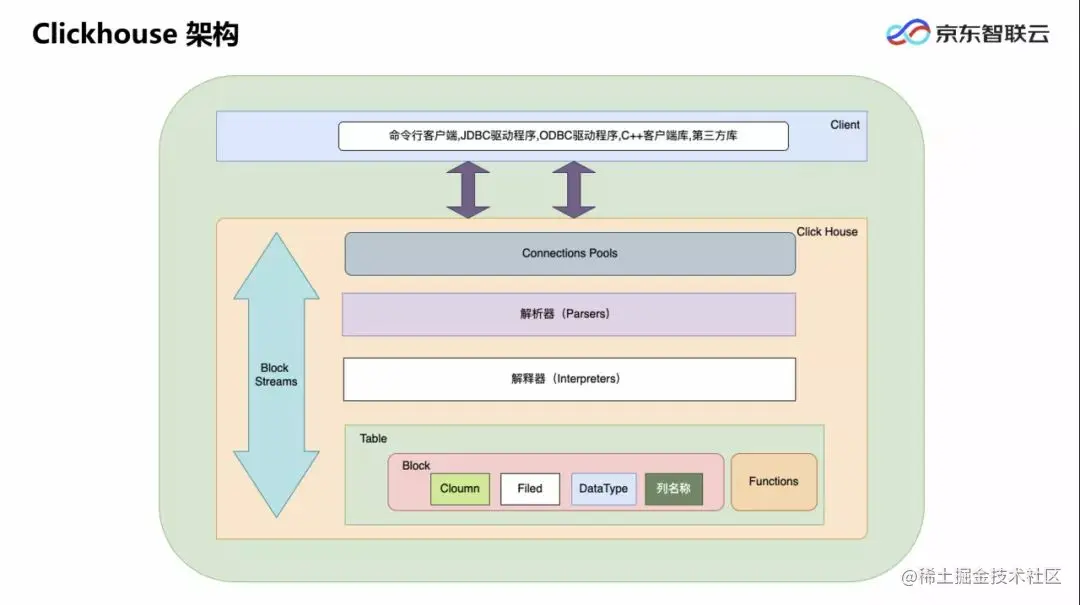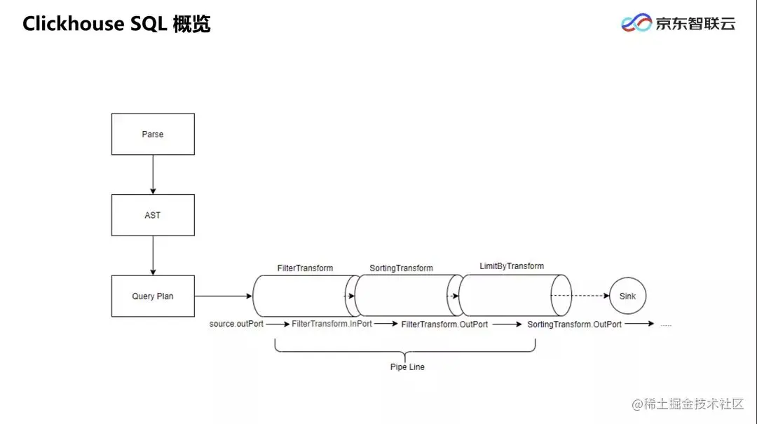 而 Clickhouse 的数据架构类似关系型数据库,其中包括了解析器,主要负责将 SQL 语句通过词法分析、语法分析等转换成计算机可读的抽象语法树。另外还有优化器,逻辑优化负责优化抽象语法树的逻辑,比如简化一些长难运算表达式,做一些语义优化等。物理优化则负责生成可以直接执行的物理执行计划,指导数据库管理系统如何获取数据表、如何进行数据 join、排序等等。 Clickhouse 的物理执行计划可认为是一个数据流图,也就是数据的有向无环图。在这个图里,数据从一个管道传到另一个管道,也就是从一个操作符传到另一个操作符。查询执行器是用来执行计划的引擎,它会从存储引擎中取出数据,并返回给客户端。