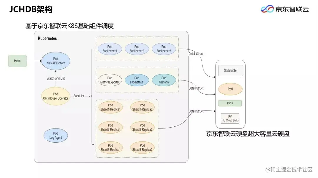 这个 operator 开发部署完毕,安装到 K8s 以后,K8s 就有了管理调度 Clickhouse 状态的能力。在它的外部会借助 helm 系统,将提前定义好的一些表单发送给 K8s,由 K8s 来根据表单里定义的这些参数来创建需要的实例。 除了创建最基础的 Clickhouse,如果需要有复制关系引擎,它也会一同创建 Zookeeper;同时为了丰富监控能力,便于 DBA 进行服务器的运维监控,它还会创建一个 Promethus,还有可视化的 Grafana。这样它就可以直接在 VPC 里通过 Grafana 来监控数据库的运维状态。 这个服务还会创建一个绑定 headless service ip 地址的域名,用户可以通过这个数据库域名直接连到这一套 Clickhouse 系统上。由上图右可见,这个 Pod 的底层存储使用了京东的云硬盘,它会在建 Pod 时申请一个 PVC 控制器,PVC 控制器会绑定京东云硬盘。这样就形成了计算与存储分离的架构,可以进一步提升计算能力。 京东智联云目前在高性能、高可用和可扩展层面上都有自己的特色:
