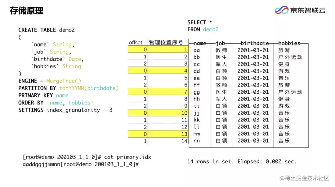 本例中,建表时设置的 SETTINGS index_granularity 设为 3。插完数据以后观察主键索引,可以发现它会把主键以每 3 条记录为一个区间,将主键信息存储在 primary.idx 里。