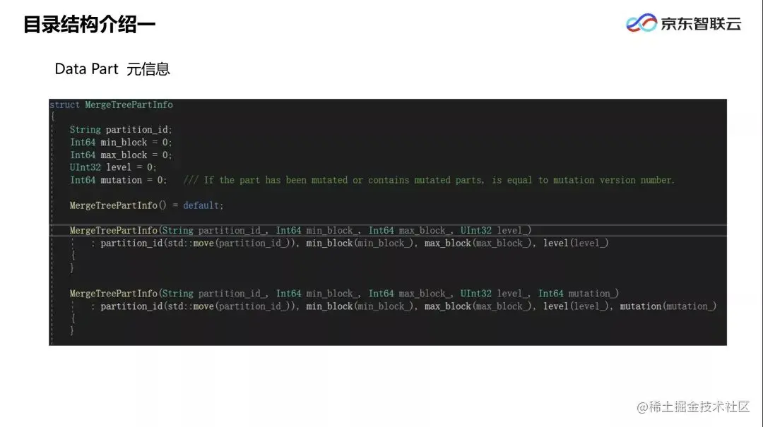 上图是 MergeTree 中对 Data part 进行元数据管理的结构体。其中,partition id 代表数据所处的分区 id;min block、max block 代表数据写入的版本信息——用户每次批量写的数据都会生成一个 Data part,同一批写入的数据会被标记为唯一的 block number。MergeTree 存储引擎后台会定期通过异步任务合并数据,且只会合并位于同一个数据分区内的数据,还要求 min block 和 max block 数据区间必须是连续非重合的。 第四个 level 字段默认新插入的数据都是 0,之后会随着合并次数的增加在原来的基础上依次增大。下面的 mutation 字段在数据更正时使用。如果要进行数据的更正操作,Clickhouse 会默认给 mutation 字段进行标记和更新。