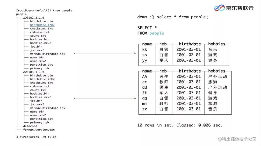 这里可以看到,10 条数据分了两个文件夹来存储。文件夹命名时,其第一部分是分区键,也就是出生日期;1_1(2_2)代表每个数据分区内数据块最小块和最大块的编号。最后的数字 0 代表合并层级。