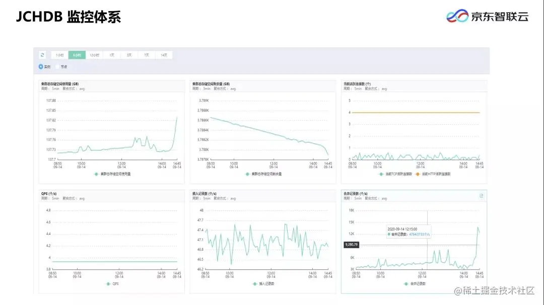 京东智联云还提供了完善的监控体系,可以帮助 DBA 更好地观察的数据库的运行状况。平台不但提供了 service 级别的数据库监控,同时还能把所有 Pod 所使用的磁盘空间、CPU、内存都展示给用户。有了这些信息,用户可以更加直观地观察到每一个 Pod 的压力分布情况,进而方便灵活地调整数据压力,避免某个 Pod 出现数据瓶颈。 根据这些监控的目标,用户可以灵活地定义告警信息。智联云支持多维度数据告警,可以通过邮件、短信、微信等形式告警。