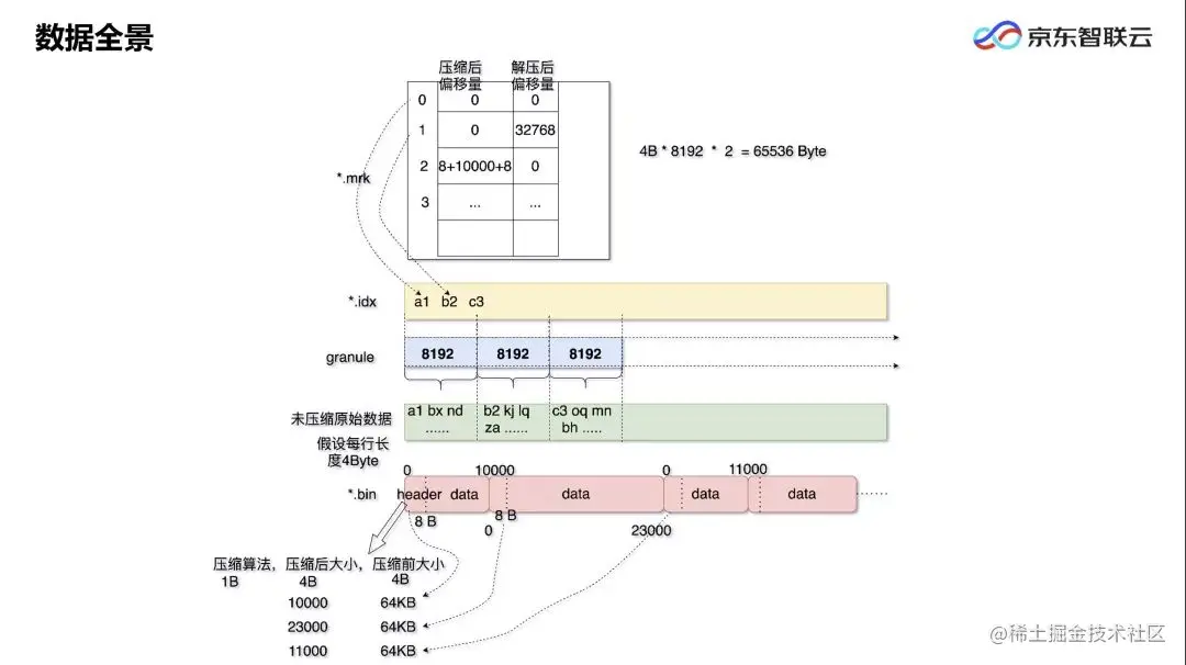 结合前文例子来看数据全景。假设下面绿颜色的就是要写入的一批数据,存放用户的名字;假设每个名字占用 4 个字节,可以看到绿颜色上边有一个 granule,写的是 8192。指定 granule 是 8192 之后,数据在写入时会放到一个具有缓冲区的 OutPort 流中,按照一个 granule 一个 granule 来写;写完第一个 granule,当发现这个缓冲区内数据大小超过 64KB,这时就会把数据进行压缩落盘,放在下边的粉红色文件块里。落数据块时会先写一个文件头,文件头由三部分组成,如上图所示。 第二段 8192 的数据,压缩完之后数据块可能比较长一些;可以发现,数据每次写入就会产生两个文件。一个是 bin 文件,也就是压缩后的数据文件。另一个文件就是主键 index 文件。但这样以来,在数据查询时不知道数据究竟在数据文件里的哪一块,不知道该怎么拆分 bin 文件,如果把整个 bin 文件都加载内存以后扫描,效率是会很差的。为了解决这个尴尬的问题 Clickhouse 引入了 mrk 文件。写数据文件的时候会把 bin 文件头信息写到 mrk 文件里。比如说第一块数据写完之后,会把起始位置、解压缩后的位置、解压缩前的位置放在 mrk 这个文件块里, 作为一行记录。查询时直接根据主键 index 记录的偏移量找到对应的 mrk 记录的某段数据的起始位置,之后读取数据即可。 MergeTree 也有一些异步任务处理,主要有三部分:首先是定期把一些有问题的、提交失败的、或写失败的数据文件清理掉;然后是定期把一些比较琐碎的插入语句生成的小文件块合并为大的文件块;还有偶尔有一些更正,例如数据的更新删除生成的临时文件,MergeTree 也会把对应的数据文件汇总成一个比较大的 Part。