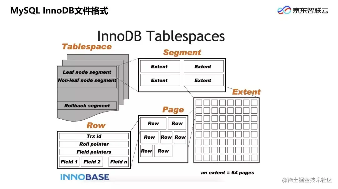 从 InnoDB 的逻辑结构图可以看到,在 InnoDB 中所有数据会被放在表空间内。表空间可以看作是 InnoDB 的逻辑最高层,由多个段组成,段又分为数据段、索引段。数据生成时按顺序写入数据段,随着数据记录的增多,InnoDB 会将一些主键值放到索引段内以实现快速定位。 随着数据量不断增多,数据库形成了名为 B+Tree 的树状结构。这个树有层级结构,会横向生长,其查询的复杂度取决于树的高度。B+Tree 的数据节点一般存储主键值,根据主键查找时可以通过叶子节点大概定位数据页,之后直接读取数据页即可。