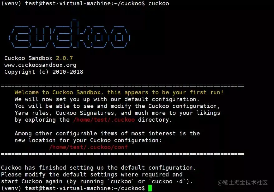 . venv/bin/activate (venv) pip2 install -U cuckoo 安装成功后如下图所示: