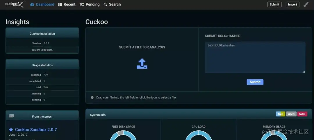 Cuckoo沙箱是一个自动化的恶意样本分析系统。通过web界面或者沙箱系统提供的web api提交可疑文件,沙箱系统即可自动分析,并在分析完毕后提供一个详细的报告,概述该文件在沙箱中执行时的行为。