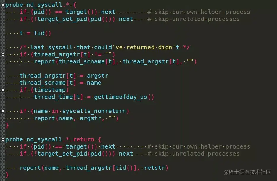 下面结合一个实际案例,详细介绍一下如何使用SystemTap监控系统调用并开发一条检测恶意样本的检测策略。 SystemTap是一个用来跟踪和探测的工具,它可以提供类似于netstat、ps、top和iostat等工具的输出信息,但是可以提供相比这些工具更加强大的跟踪和探测能力。 SystemTap是一个框架,具体的分析逻辑需要通过SystemTap脚本实现。SystemTap脚本由两部分组成:events和handlers,即事件和相应的处理程序。事件及其相应的处理程序统称为探针(probe),一个SystemTap脚本可以有多个探针。下图为cuckoo中用来监控系统调用的探针。