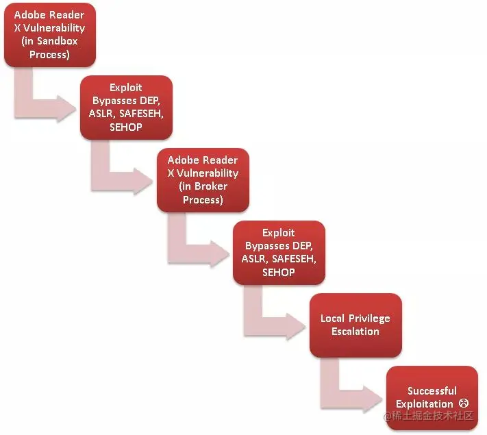▲Adobe Reader X加入沙箱之后的漏洞利用流程▲
