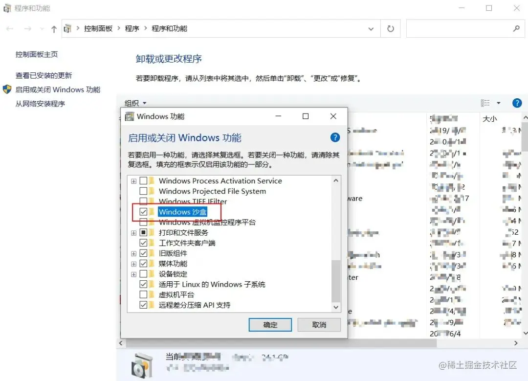 微软在Windows 10 18305版本之后的专业版和企业版中加入了沙箱功能,可以通过Windows功能界面开启沙箱。
