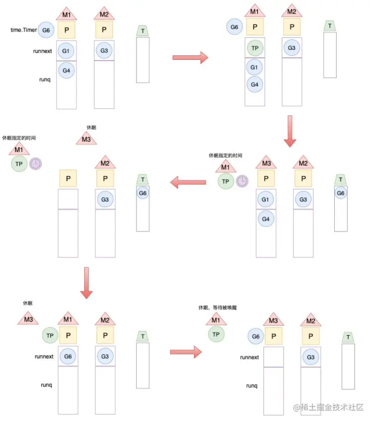 - TimerProc休眠到期后,重新唤醒P,执行TimerProc将G6恢复到P的本地队列,等待执行。TimerProc则再次和M1休眠,等待下一次创建timer时被唤醒