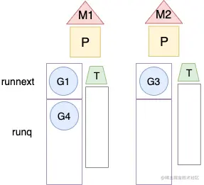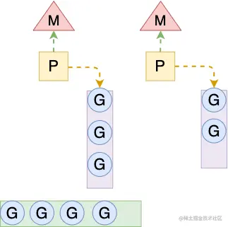 M必须持有P才能执行G中的代码,P有自己本地的一个运行队列runq,由可运行的G组成,下图展示了 线程 M、处理器 P 和 goroutine 的关系。