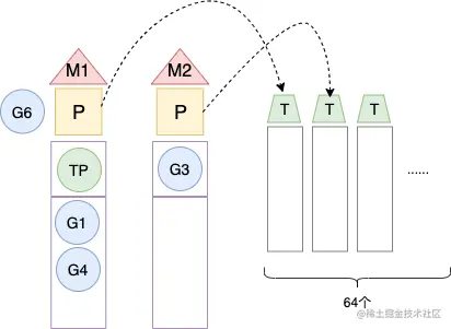 - P调度执行TimerProc的G时,调用函数让出P,G是在M1上执行的,线程休眠,G6阻塞在channel上,保存到堆上