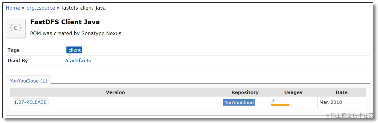 FastDFS 的作者余庆先生已经为我们开发好了 Java 对应的 SDK。这里需要解释一下:作者余庆并没有及时更新最新的 Java SDK 至 Maven 中央仓库,目前中央仓库最新版仍旧是 1.27 版。所以我们需要通过 Github:github.com/happyfish10… 下载项目源码,再通过命令 mvn clean install 编译打包导入 Maven 本地仓库使用即可。