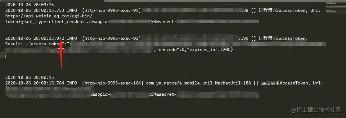 6号晚上8点钟,194这个appid在同一秒内发生了12次获取token的请求,并且线程号都不相同,这说明是同一秒内有多个用户进行了操作,并且这时候redis中的token已经失效,但是因为系统代码中获取token的代码块,做了redis分布式锁的处理,按道理来说不应该出现同一秒内多个资源请求呀,