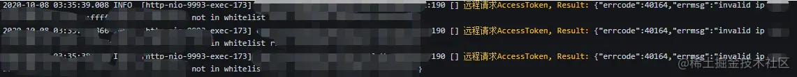 这里获取token的时候,出现了白名单问题,开始我们以为是这台发送请求的服务器,没有在微信白名单内,但是根据我们到微信公众平台上查看,这台服务器的ip是设置到了微信公众平台上的,这里就又出现了疑问,这是为啥?关键是这台服务器有的请求token是成功获取了的,但是有的就失败~