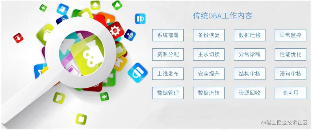 传统DBA岗位的具体工作是什么呢?不同公司有着不同的企业文化、业务特点、系统架构、技术积累等,所以DBA职位的工作内容也不近相同。在大公司会将DBA分为运维DBA和开发DBA,分别侧重数据库运维和数据库开发使用两个方向。而小公司DBA的工作就不会分那么清了,总体的工作还是围绕数据库运维和使用开展的。 从招聘网站中关于DBA职位的需求信息可以看出,DBA的工作主要包括以下内容: