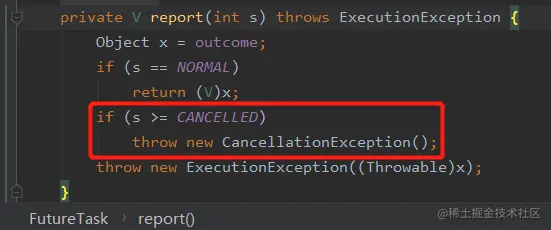 如果变量 s (即状态)是 INTERRUPING (值是 5),那么是大于 CANCELLED (值是 4)状态的,则抛出 CancellationException (CE)异常。