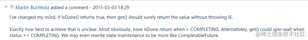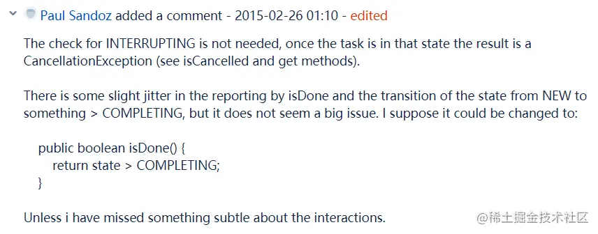 - Martin 老哥提出 BUG 说 FutureTask#isDone 方法没有判断 INTERRUPING 和 COMPLETING 这个两个中间状态是不对的。