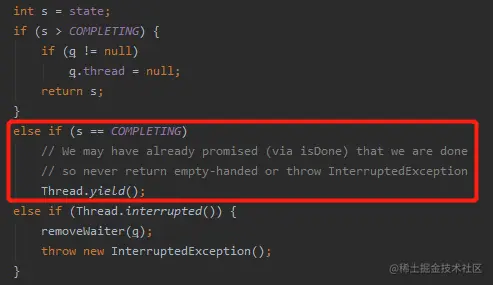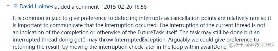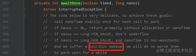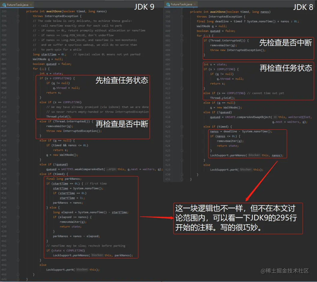 然后多说一句 JDK 9 现在的 FutureTask#awaitDone 里面有这样的一行注释:
