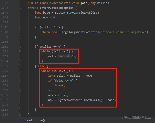 在 join 方法中,isAlive 方法就是这里的 condition does not hold。