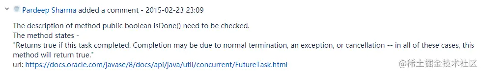 这个 BUG 说:FutureTask.isDone 方法在任务还没有完成的时候就会返回 true。