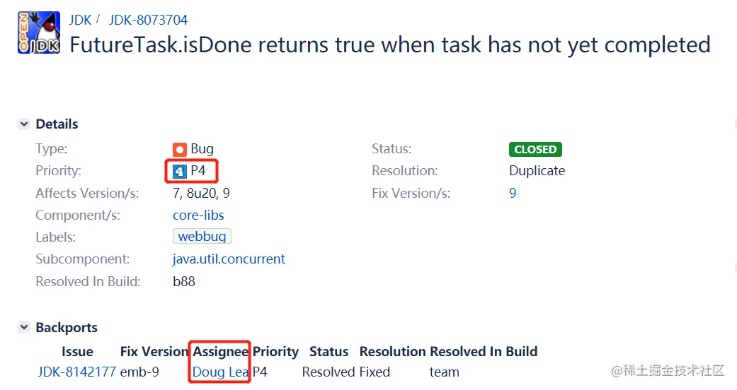可以看到,这是一个 P4 级别(优先级不高)的 BUG,这个 BUG 也是分配给了 Doug Lea,因为 FutureTask 类就是他写的: