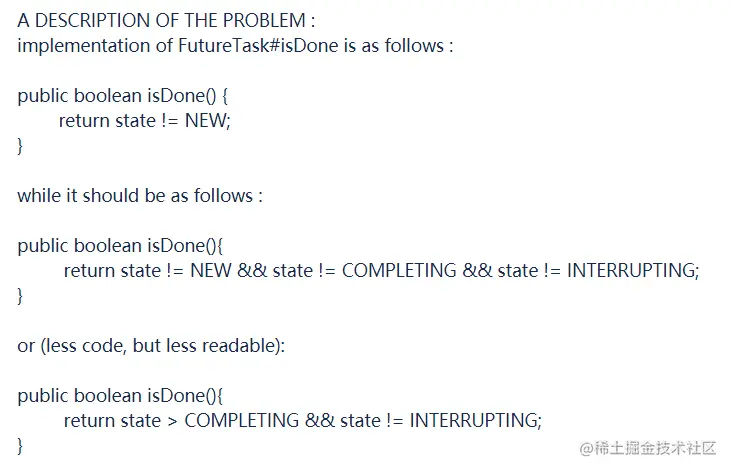 FutureTask.isDone 方法在任务还没有完成的时候,比如还是 COMPLETING 和 INTERRUPTING 的时候就会返回 true,这样是不对的。这就是 BUG。