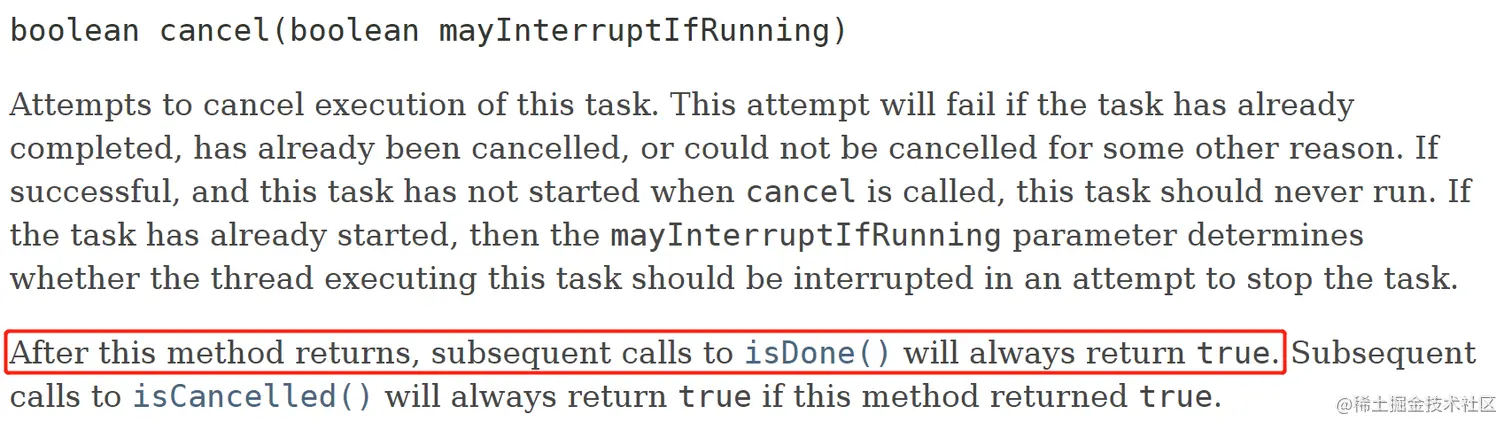 文档的方法说明上说:如果调用了 cancel 方法,那么再调用 isDone 将永远返回 true。