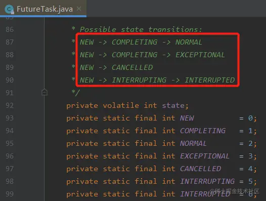 在示例代码中,前面的 while 循环中的 isDone 方法已经返回了 true,说明当前状态肯定不是 NEW。