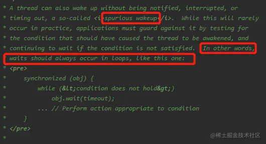 一个线程能在没有被通知、中断或超时的情况下唤醒,也即所谓的“虚假唤醒”,虽然这点在实践中很少发生,但是程序应该循环检测导致线程唤醒的条件,并在条件不满足的情况下继续等待,来防止虚假唤醒。