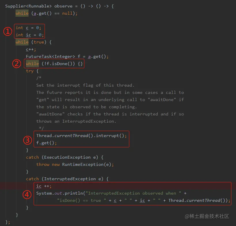 首先标号为 ① 的地方是两个计数器,c 代表的是第一个 while 循环的次数,ic 代表的是抛出 InterruptedException(IE) 的次数。