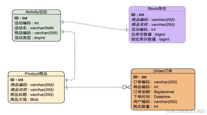 于是我们可以得到秒杀活动中,数据库之间的关系如图所示