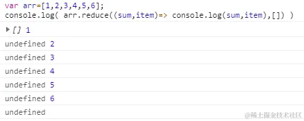 console.log( arr.reduce((sum,item)=> console.log(sum,item),[]) )